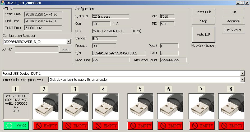 После разборки, выяснилось, что флэшка на контроллере Skymedi SK6211 B8PC8A. Далее идем на сайт http://www.flashboot.ru, и в меню Файлы ищем утилиты для работы с нашим контроллером. Микросхема памяти в данном случае была Intel 29F64G08CAMDB. Методом проб подобрана утилита, которая поняла память на флэшке, - SK6211_PDT_20090828_A (прямая ссылка на архив утилиты). Запускаем SK6211_20090820.exe, выбираем в Configuration Selection настройки под нашу микросхему памяти (см. ниже на рисунке), жмем Auto-LLF и через 1-2 минуты можно начинать пользоваться флэшкой по прямому назначению, если форматирование пройдет удачно (должно появиться зеленым цветом слово PASS). Внимание!!! Повторение описанной процедуры приведет к удалению Ваших данных. Если данные на флэшке нужны, от форматирования нужно воздержаться!